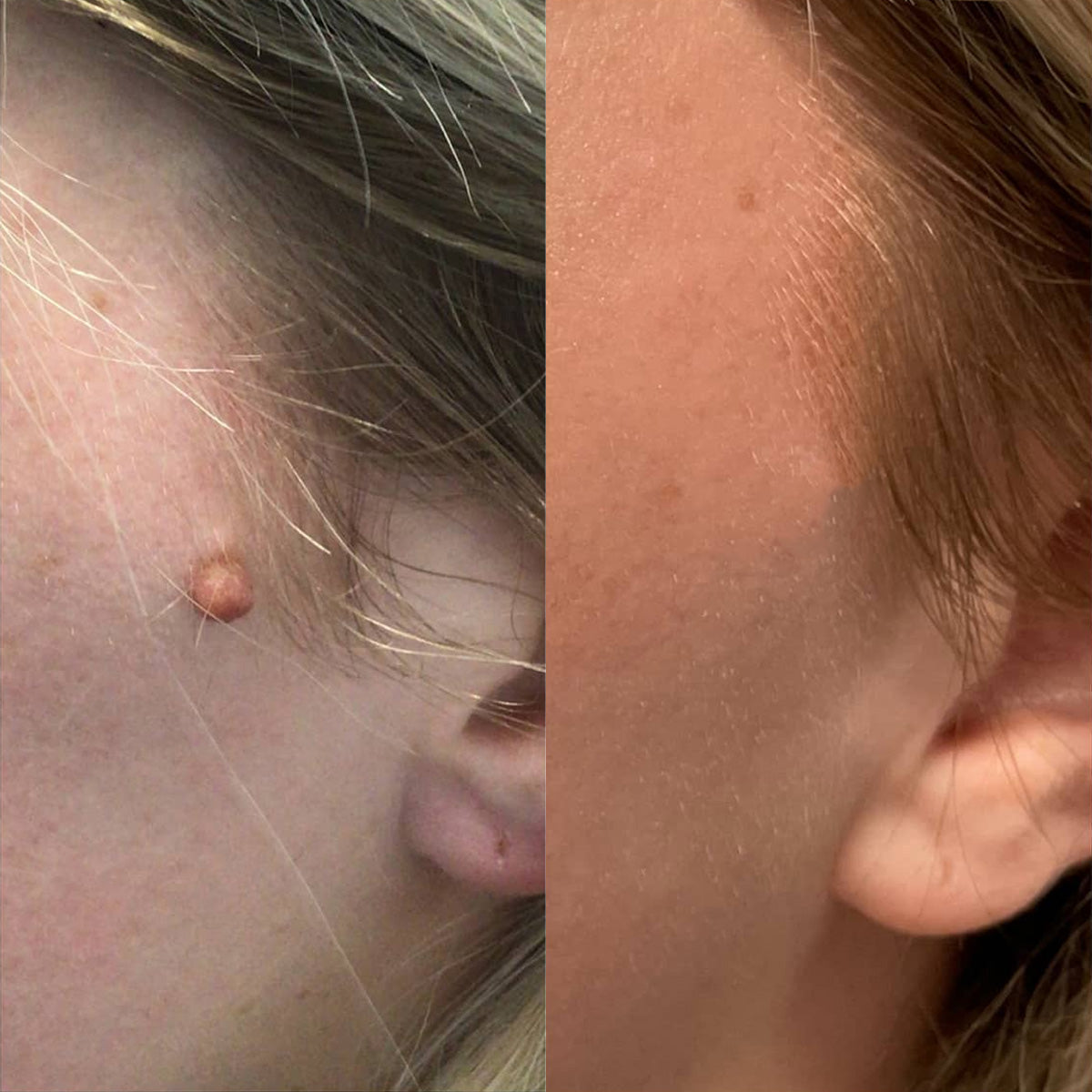 Das getrocknete Hautanhängsel löst sich auf natürliche Weise – darunter kommt glatte, klare Haut zum Vorschein.
