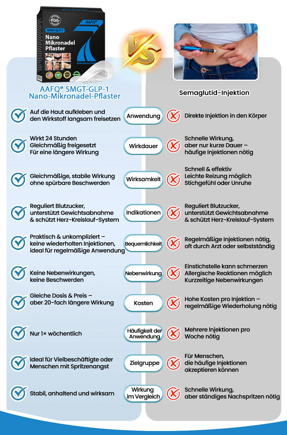 Das AAFQ® SMGT-GLP-1 Nano-Mikronadel-Pflaster hingegen sorgt für eine kontinuierliche und langanhaltende Wirkstofffreisetzung über 24 Stunden – ganz ohne Schmerzen oder Unannehmlichkeiten.